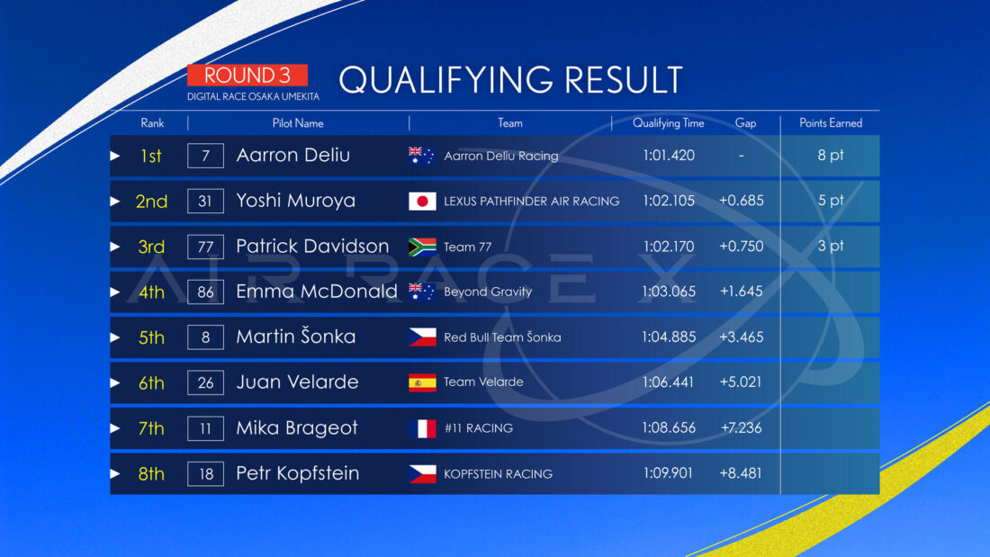 もう一方では、元世界チャンピオンのマルティン・ソンカ(チェコ)に対し、デリューが2秒ペナルティを受けながらも圧巻の巻き返しで勝利。決勝進出を果たし、3人のうち室屋のみが3位決定戦へ回ることとなった。