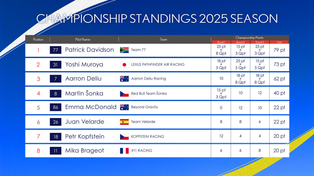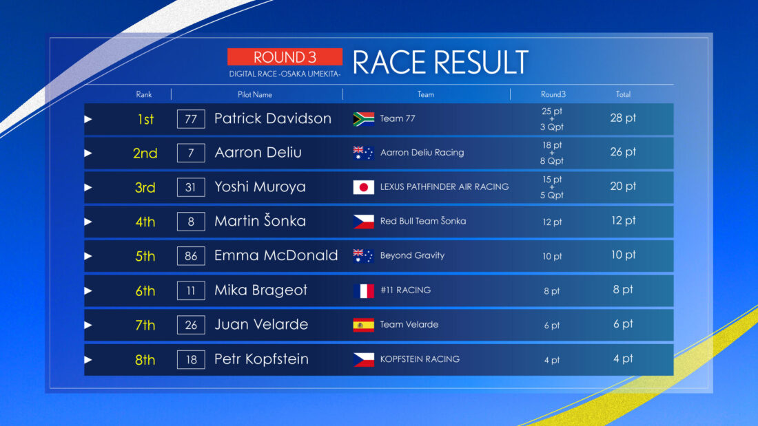 2年連続王者を狙う室屋義秀(日本)、わずか2ポイント差のパトリック・デビッドソン(南アフリカ)、そして驚異的な速さで台頭するルーキー、アーロン・デリュー(オーストラリア)。2025年シリーズ最終戦は、この3人によるチャンピオン争いとなった。舞台は大阪・うめきた。都市空間をデジタルツイン化した新トラックで初のレースが繰り広げられた。