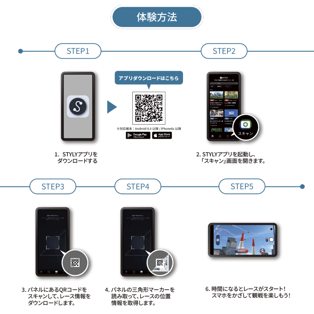 観客はスマートフォンやタブレットを使い、STYLYアプリを起動して都市の風景にレース機が飛んでいる様子を目の前で見ることができます。現実の街並みに仮想オブジェクトが重なることで、まるでその場所で機体が飛んでいるかのような感覚を得られる体験です。